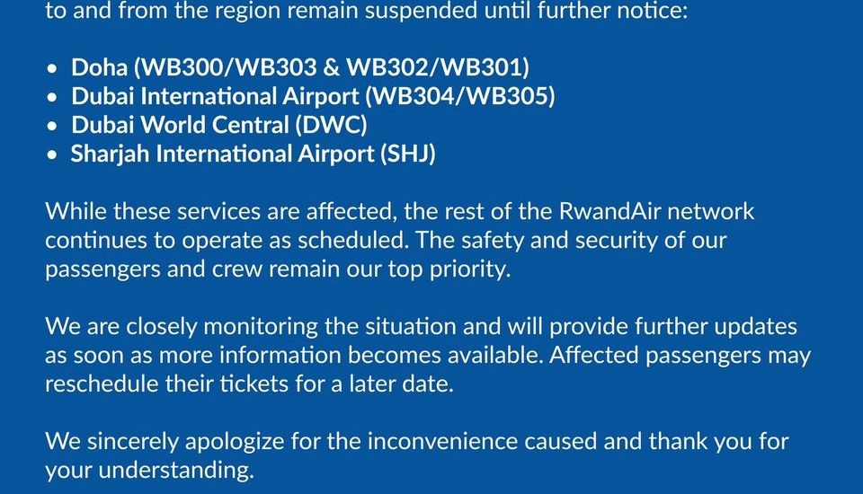 RwandAir has announced a temporary suspension of flights to and from selected Middle East destinations due to the ongoing situation in the region. The suspension remains in effect until further notice.